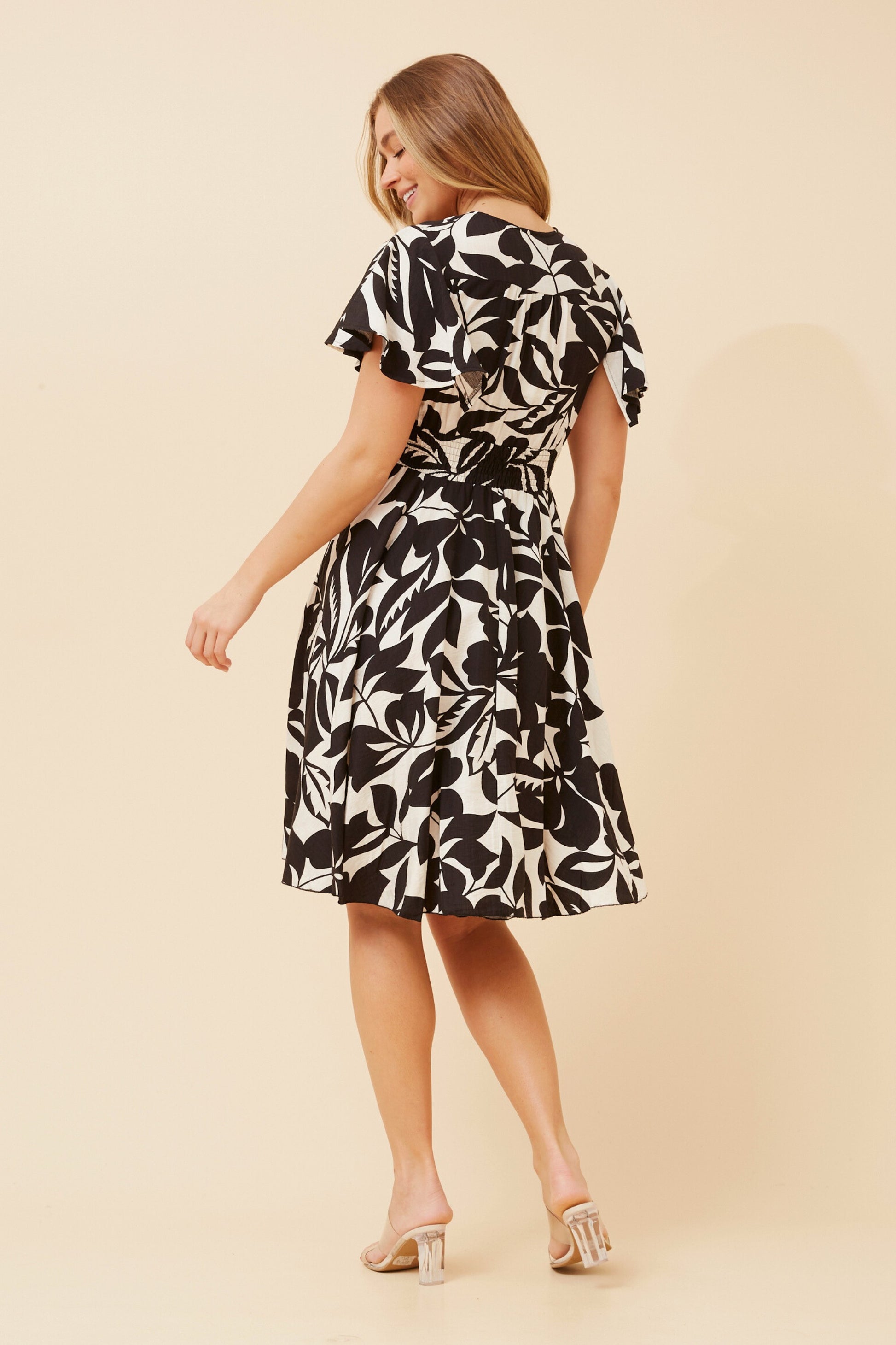 Discover a dress that celebrates your personal style with confidence. This beautiful black and white piece features a bold leaf print that brings together the best of classic and modern aesthetics, so you can feel assured you're wearing something truly special. The flutter sleeves offer a gentle, flattering touch, while the smocked waistline provides comfortable support and a shape-enhancing fit. Whether you're dressing for everyday moments or special occasions, this dress empowers you to look and feel your absolute best.