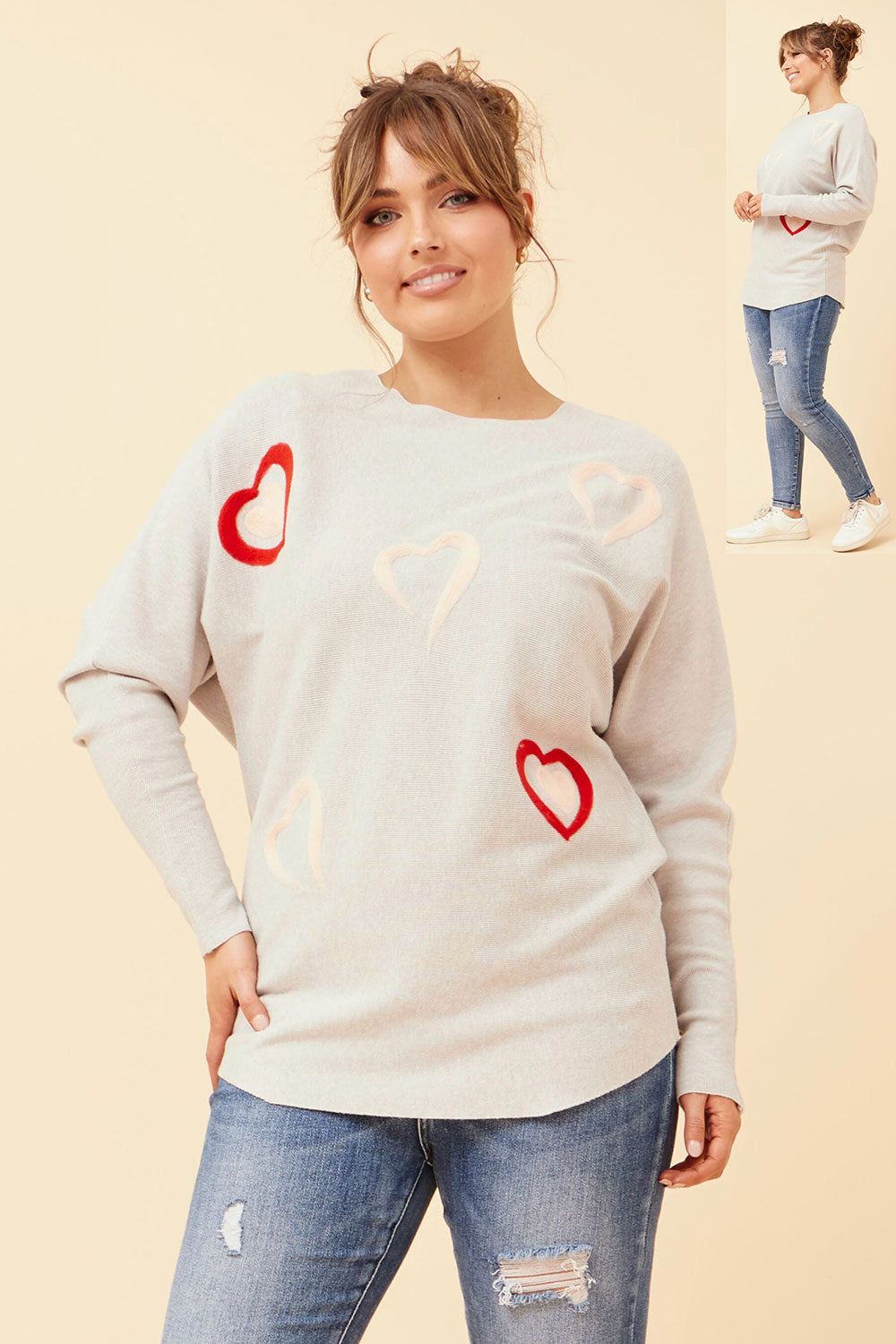Introducing our charming heart embroidered jumper! This cozy, light grey knit features playful heart designs in soft hues of red and cream, adding a touch of whimsy to your wardrobe. With its relaxed fit and long sleeves, it’s perfect for layering or wearing solo. Pair it with your favourite distressed jeans for a casual yet stylish look. Ideal for chilly days. Spread the love in style!